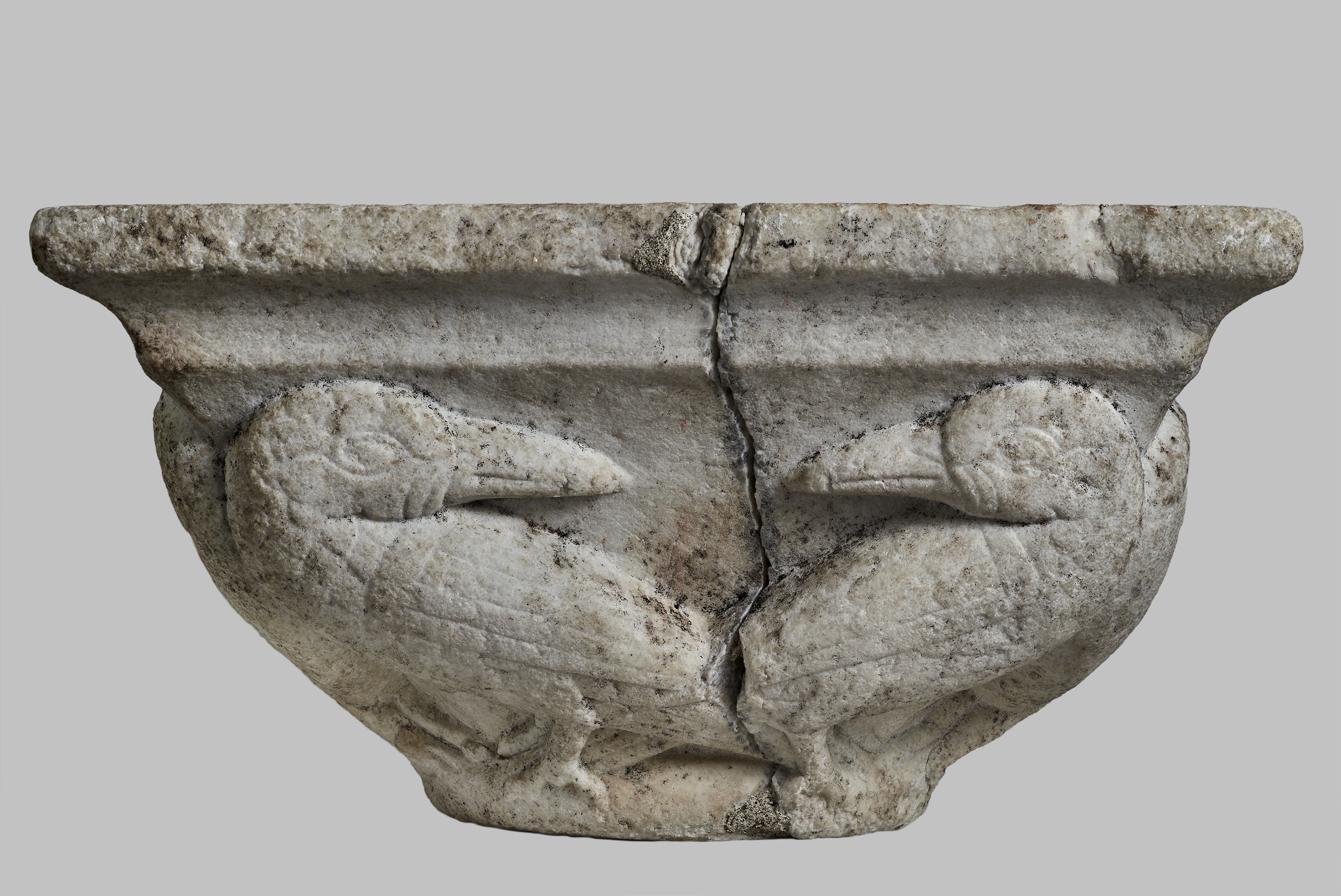 Cette paire de chapiteaux à motifs d’oiseaux et d’animaux fantastiques ailés nous transporte dans le monde roman. Très souvent l’association d’un oiseau (symbole de l’air) et d’un animal rattaché à la terre peut symboliser la dualité de l’homme : corps et esprit. Gérard de Champeaux et Sébastien Sterckx rappellent dans leur ouvrage fort documenté Introduction au monde des symboles, (p. 256) que les deux archétypes fondamentaux du psychisme humain [sont]: l'oiseau - ou plus précisément l'aile, la plume - et l'animal terrestre ; tous deux étant combinés autour du schème de la verticalisation pour exprimer le mystérieux composé qu'est l'homme : corps et esprit. L'art roman a hérité cet hybride imaginaire que lui léguaient les plus anciennes civilisations et tout incline à croire qu'il l'a souvent utilisé à son tour pour symboliser l'éternel mystère de l'homme. Le thème est complexe. Les églises romanes l'ont reproduit à des milliers et des milliers d'exemplaires... Dans notre exemple, cette dualité permanente dans le monde roman pourrait trouver une explication dans le combat entre le bien et le mal. L’oiseau étant symbole du bien alors que l’animal fantastique est en lien avec le monde sombre. L’utilisation du marbre blanc comme matériau pourrait, semble-t-il, rattacher le travail de sculpture à l’aire géographique italienne.